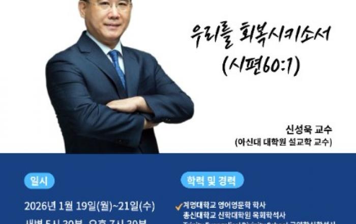 [채석일 기자]예천제일교회(김운수 목사)가 오는 19일(월) 새벽5시30분 부터 21일까지 사흘간 아신대 대학원 설교학 교수인 신성욱 교수를 초청 , 2026년도 부흥사경회를 개최한다고 밝혔다.이번 부흥사경회는 "우리를 회복시키소서(시편60:1)"라는 주제로 19일 새