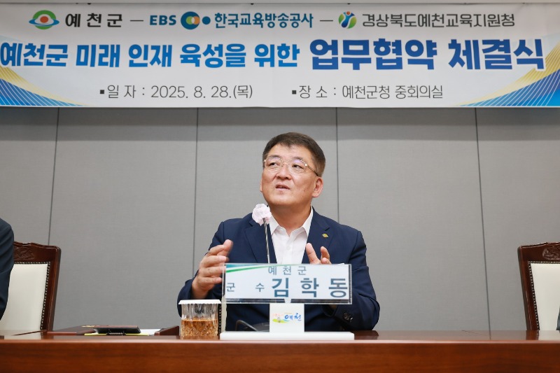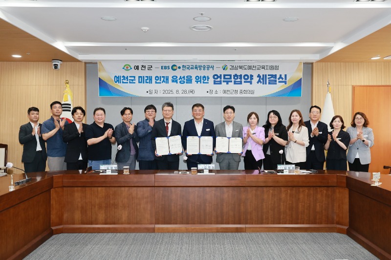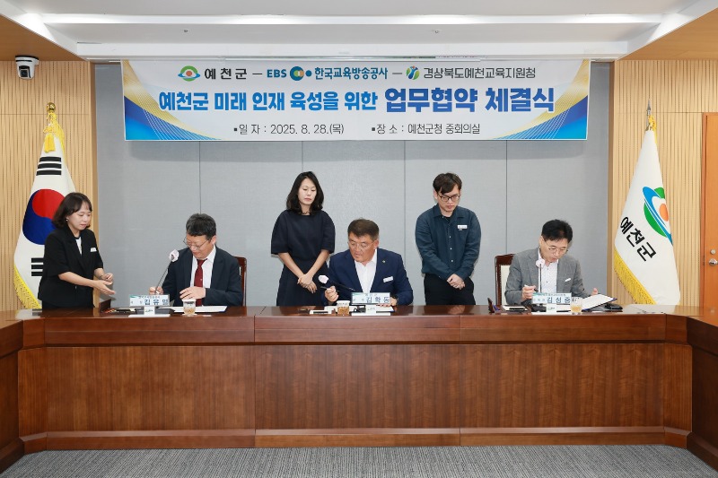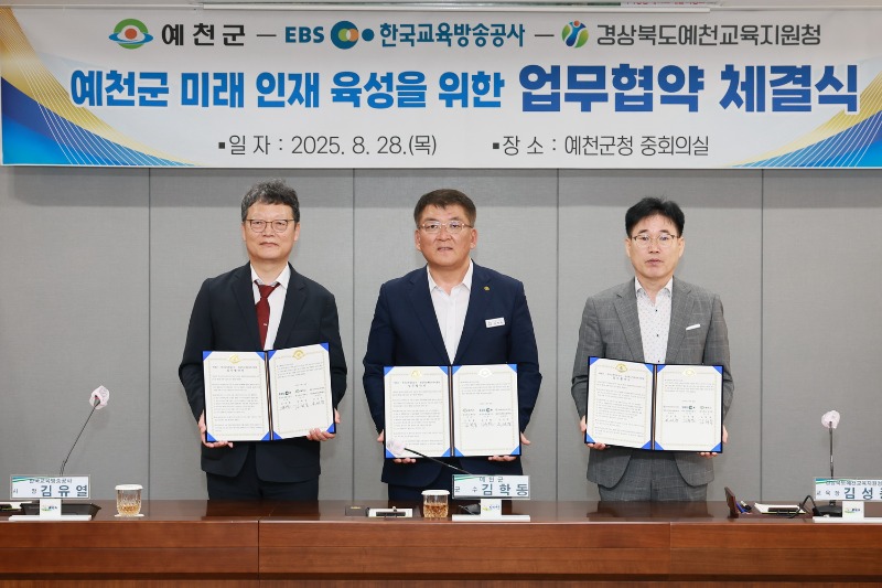예천군(군수 김학동)은 28일, 군청 3층 중회의실에서 한국교육방송공사(EBS), 경상북도예천교육지원청과 함께 지역 청소년의 자기주도학습 역량 강화와 미래 인재 육성을 위한 업무협약(MOU)을 체결했다.
