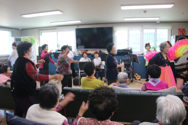 우쿨마을 동아리 김애자 회장의 사회로 시작된 공연은 동아리 홍의숙 회원의 숄더건반 연주 ‘어머님 은혜’를 지작으로 우쿨렐레와 하모니카 연주, 부채춤등으로 어르신들의 마음을 사로잡았고, 부채춤 공연은 어르신들의 눈과 귀를 즐겁게 하며 어르신들은 자리에서 일어나 덩실덩실 함께 춤을추며, 신명나는 시간을 보냈다.