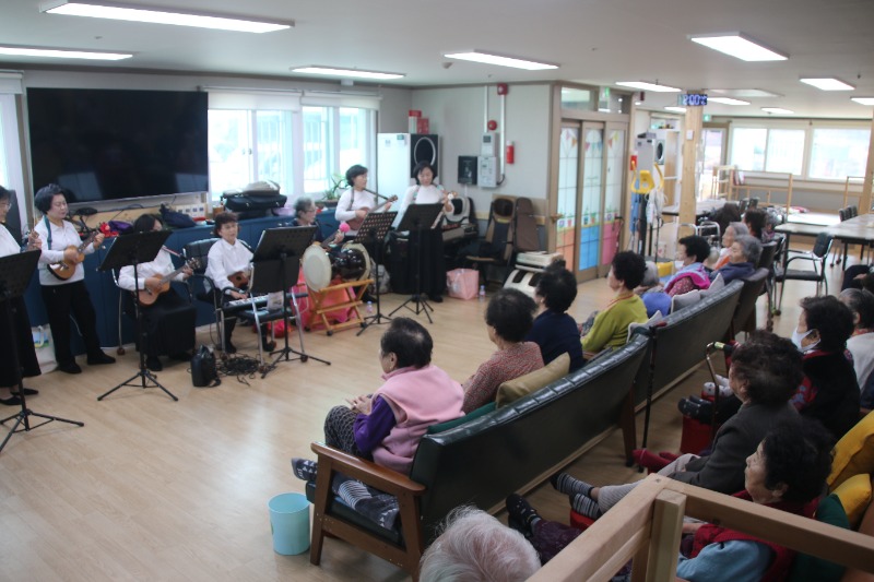 이날 어르신들과 함께한 시간은 예천군도시재생사업의 일환으로 선정됀 동아리 ‘모이다 우쿨마을’회원들이 우쿨렐레와 하모니카,장구,부채춤,숄더건반연주,합창등 다양한 프로그램으로 요양원을 찾아 재능기부 봉사 공연을 펼친 것이다.