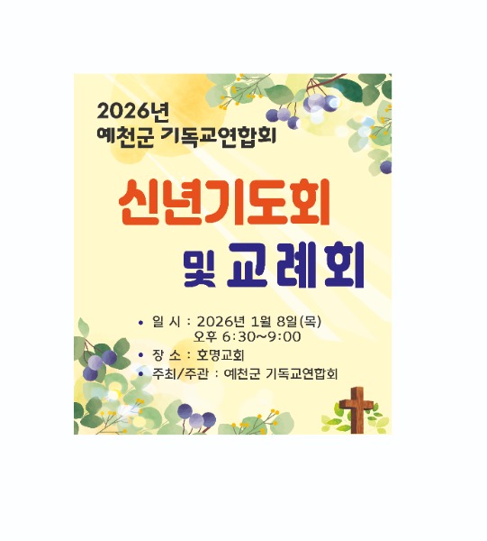 [채석일 기자]예천군기독교연합회(회장 도재근 목사.호명교회)는 2026년 신년기도회 및 교례회를 오는 2026년 1월8일 저녁6시30분부터 호명교회(도재근 목사)에서 개최한다고 밝혔다.