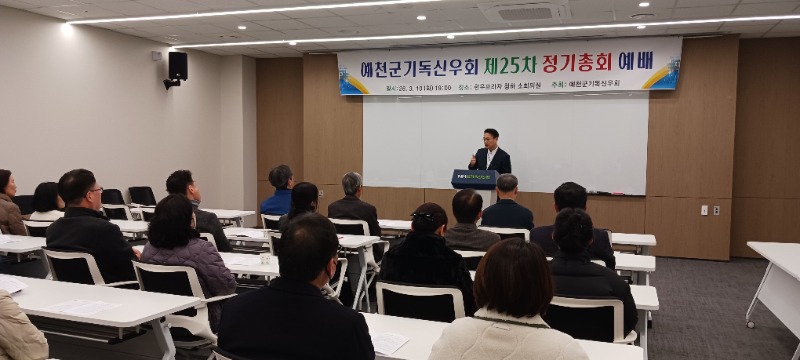 1부 예배에 이어 2부 총회에서는 황칠환 회장(예천교회 장로)의 사회로 최국낙 장로(예천교회)의 기도,서기 박성윤 장로(금곡교회)의 회원점명에 이은 감사보고 및 사업,회계보고와함께 2026년도 신 임원을 선출 했으며 신 안건 토의 시간과 신임회장(채석일 장로.예천백합교회)의 기도 및 폐회 후 소통의 시간을 나눴다.