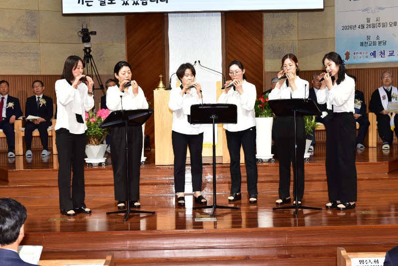 전노회장 김윤기 목사(어신교회)의 권면과 영주노회장 황강섭 장로(성남교회)의 축사가 이어졌으며, 예천교회 여울오카리나앙상블 특별찬양은 예배의 감동을 더했다.